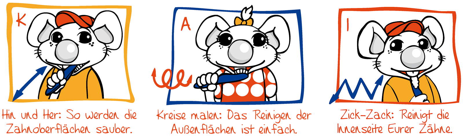 Ab 2 Jahren 2x täglich mit einer erbsengrossen Portion Kinderzahnpasta wird die Zahnpflege nach der KAI-Methode empfohlen.
