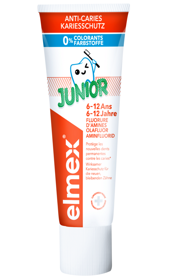 Die elmex® Junior Zahnpasta für 6–12 Jährige mit dem hochwirksamen Aminfluorid wurde speziell für die Bedürfnisse des Wechselgebisses entwickelt.