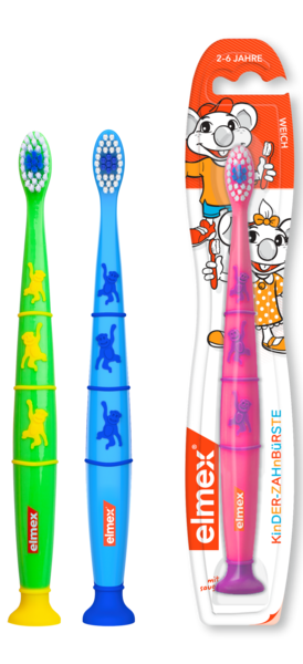 Um die ersten eigenen Putzversuche zu fördern, sollten Sie Ihrem Kind eine auf seine motorischen Fähigkeiten angepasste Zahnbürste geben. Die elmex® Kinder- Zahnbürste unterstützt Kinder beim spielerischen Erlernen des Zähneputzens